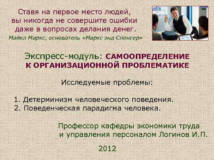Ставя на первое место людей, вы никогда не совершите ошибки даже в вопросах делания денег. Майкл Маркс, основатель «Маркс энд Спенсер» Экспресс-модуль: САМООПРЕДЕЛЕНИЕ К ОРГАНИЗАЦИОННОЙ ПРОБЛЕМАТИКЕ Исследуемые проблемы: 1. Детерминизм человеческого поведения. 2. Поведенческая парадигма человека. Профессор кафедры экономики труда и управления персоналом Логинов И. П. 2012