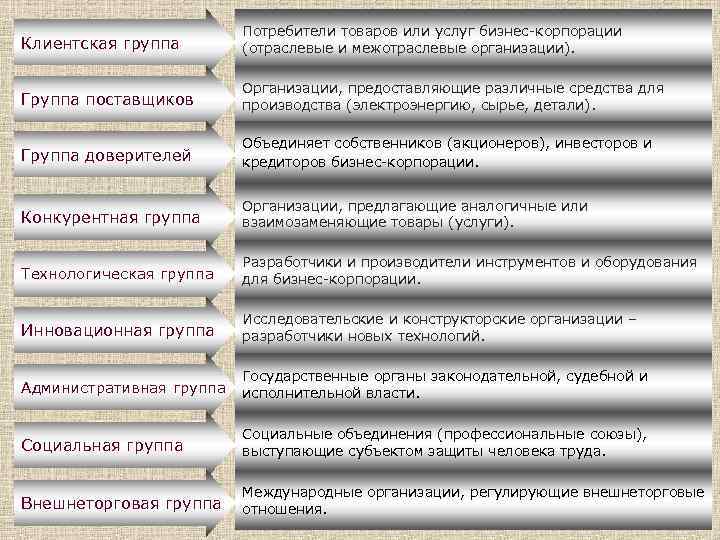 Клиентская группа Потребители товаров или услуг бизнес-корпорации (отраслевые и межотраслевые организации). Группа поставщиков Организации, предоставляющие различные средства для производства (электроэнергию, сырье, детали). Группа доверителей Объединяет собственников (акционеров), инвесторов и кредиторов бизнес-корпорации. Конкурентная группа Организации, предлагающие аналогичные или взаимозаменяющие товары (услуги). Технологическая группа Разработчики и производители инструментов и оборудования для бизнес-корпорации. Инновационная группа Исследовательские и конструкторские организации – разработчики новых технологий. Административная группа Государственные органы законодательной, судебной и исполнительной власти. Социальная группа Социальные объединения (профессиональные союзы), выступающие субъектом защиты человека труда. Внешнеторговая группа Международные организации, регулирующие внешнеторговые отношения.