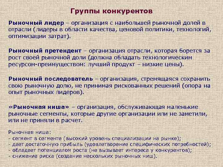 Группы конкурентов Рыночный лидер – организация с наибольшей рыночной долей в отрасли (лидеры в области качества, ценовой политики, технологий, оптимизации затрат). Рыночный претендент – организация отрасли, которая борется за рост своей рыночной доли (должна обладать технологическим ресурсом-преимуществом: лучший продукт – низкие цены). Рыночный последователь – организация, стремящаяся сохранить свою рыночную долю, не принимая рискованных решений (опора на опыт рыночных лидеров). «Рыночная ниша» – организация, обслуживающая маленькие рыночные сегменты, которые другие организации или не заметили, или не приняли в расчет. Рыночная ниша: - сегмент в сегменте (высокий уровень специализации на рынке); - дает достаточную прибыль (удовлетворение специфических потребностей); - обладает потенциалом роста (не вызывает интереса у конкурентов); - снижение риска (создание нескольких рыночных ниш).