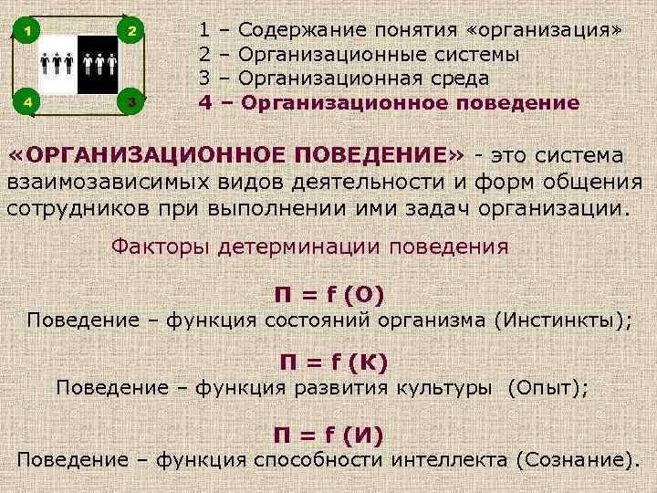 1 2 4 3 1 – Содержание понятия «организация» 2 – Организационные системы 3 – Организационная среда 4 – Организационное поведение «ОРГАНИЗАЦИОННОЕ ПОВЕДЕНИЕ» - это система взаимозависимых видов деятельности и форм общения сотрудников при выполнении ими задач организации. Факторы детерминации поведения П = f (О) Поведение – функция состояний организма (Инстинкты); П = f (К) Поведение – функция развития культуры (Опыт); П = f (И) Поведение – функция способности интеллекта (Сознание).