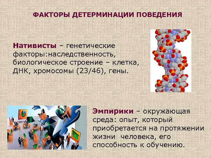 ФАКТОРЫ ДЕТЕРМИНАЦИИ ПОВЕДЕНИЯ Нативисты – генетические факторы: наследственность, биологическое строение – клетка, ДНК, хромосомы (23/46), гены. Эмпирики – окружающая среда: опыт, который приобретается на протяжении жизни человека, его способность к обучению.
