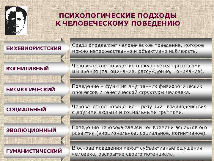 ПСИХОЛОГИЧЕСКИЕ ПОДХОДЫ К ЧЕЛОВЕЧЕСКОМУ ПОВЕДЕНИЮ БИХЕВИОРИСТСКИЙ Среда определяет человеческое поведение, которое можно непосредственно и объективно наблюдать. КОГНИТИВНЫЙ Человеческое поведение определяется процессами мышления (запоминание, рассуждение, понимание). БИОЛОГИЧЕСКИЙ Поведение – функция внутренних физиологических процессов и генетической структуры человека. СОЦИАЛЬНЫЙ Человеческое поведение – результат взаимодействия с другими людьми и социальными группами. ЭВОЛЮЦИОННЫЙ Поведение человека зависит от времени аспектов его развития (эмоциональное, социальное, когнитивное). ГУМАНИСТИЧЕСКИЙ В основе поведения лежат субъективные ощущения человека, раскрытие своего потенциала.