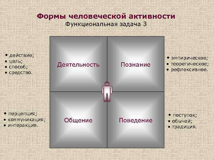 Формы человеческой активности Функциональная задача 3 • действие; • цель; • способ; • средство. • перцепция; • коммуникация; • интеракция. • эмпирическое; Деятельность Общение Познание Поведение • теоретическое; • рефлексивное. • поступок; • обычай; • традиция.