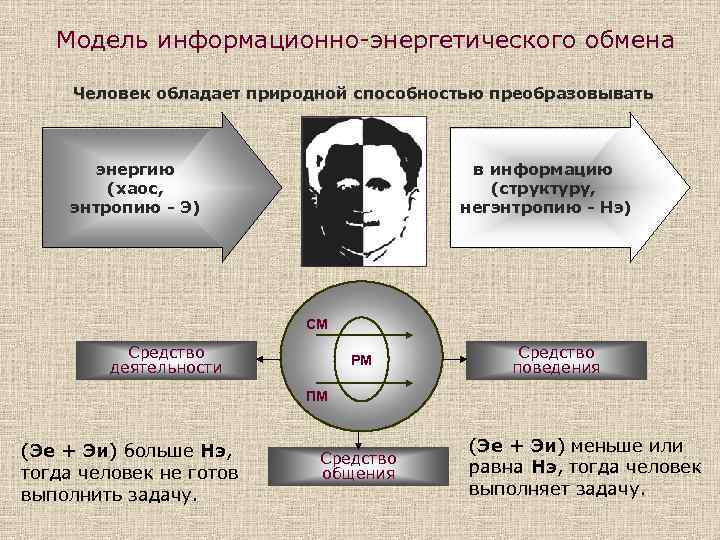 Модель информационно-энергетического обмена Человек обладает природной способностью преобразовывать энергию (хаос, энтропию - Э) в информацию (структуру, негэнтропию - Нэ) СМ Средство деятельности РМ Средство поведения ПМ (Эе + Эи) больше Нэ, тогда человек не готов выполнить задачу. Средство общения (Эе + Эи) меньше или равна Нэ, тогда человек выполняет задачу.