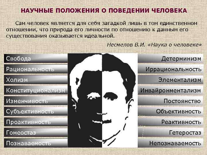 НАУЧНЫЕ ПОЛОЖЕНИЯ О ПОВЕДЕНИИ ЧЕЛОВЕКА Сам человек является для себя загадкой лишь в том единственном отношении, что природа его личности по отношению к данным его существования оказывается идеальной. Несмелов В. И. «Наука о человеке» Свобода Рациональность Холизм Конституционализм Изменчивость Субъективность Проактивность Гомеостаз Познаваемость Детерминизм Иррациональность Элементализм Инвайронментализм Постоянство Объективность Реактивность Гетеростаз Непознаваемость