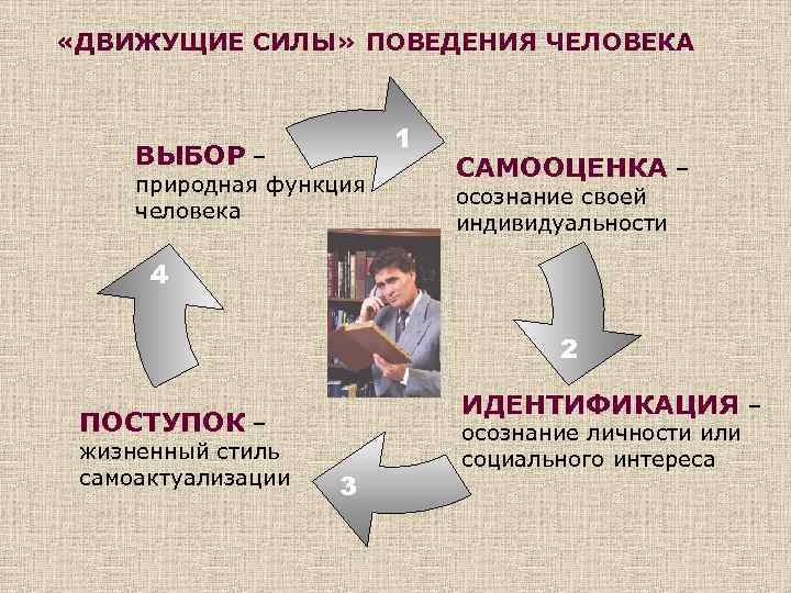 «ДВИЖУЩИЕ СИЛЫ» ПОВЕДЕНИЯ ЧЕЛОВЕКА 1 ВЫБОР – природная функция человека САМООЦЕНКА – осознание своей индивидуальности 4 2 ИДЕНТИФИКАЦИЯ – ПОСТУПОК – жизненный стиль самоактуализации 3 осознание личности или социального интереса