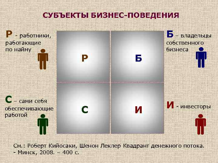 СУБЪЕКТЫ БИЗНЕС-ПОВЕДЕНИЯ Б – владельцы Р - работники, работающие по найму С – сами себя обеспечивающие работой Р С Б И собственного бизнеса И - инвесторы См. : Роберт Кийосаки, Шенон Леклер Квадрант денежного потока. - Минск, 2008. – 400 с.