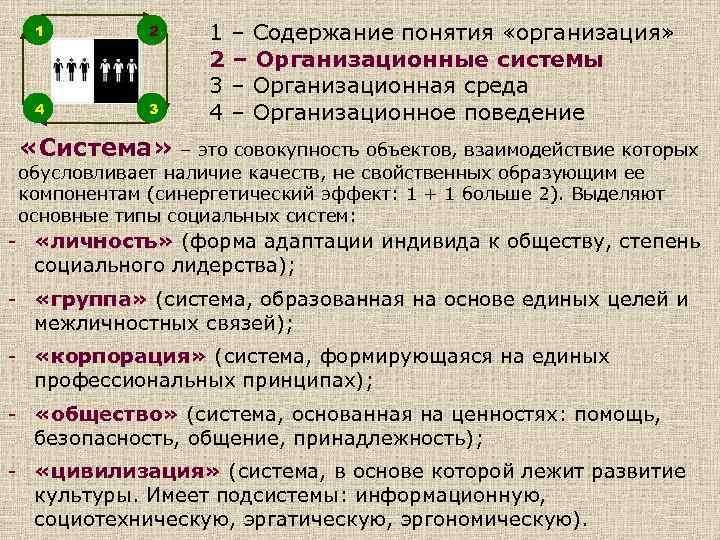 1 2 4 3 1 – Содержание понятия «организация» 2 – Организационные системы 3 – Организационная среда 4 – Организационное поведение «Система» – это совокупность объектов, взаимодействие которых обусловливает наличие качеств, не свойственных образующим ее компонентам (синергетический эффект: 1 + 1 больше 2). Выделяют основные типы социальных систем: - «личность» (форма адаптации индивида к обществу, степень социального лидерства); - «группа» (система, образованная на основе единых целей и межличностных связей); - «корпорация» (система, формирующаяся на единых профессиональных принципах); - «общество» (система, основанная на ценностях: помощь, безопасность, общение, принадлежность); - «цивилизация» (система, в основе которой лежит развитие культуры. Имеет подсистемы: информационную, социотехническую, эргатическую, эргономическую).