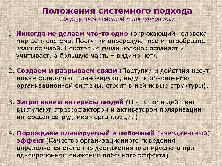 Положения системного подхода посредством действий и поступков мы: 1. Никогда не делаем что-то одно (окружающий человека мир есть система. Поступки опосредуют все многообразие взаимосвязей. Некоторые связи человек осознает и учитывает, а большую часть – видимо нет). 2. Создаем и разрываем связи (Поступки и действия несут новые стандарты – инновируют, ведут к обновлению организационной системы, строят в ней новые структуры). 3. Затрагиваем интересы людей (Поступки и действия выступают стрессофактором и активатором поляризации интересов сотрудников организации). 4. Порождаем планируемый и побочный (эмерджентный) эффект (Качество организационного поведения определяется степенью достижения планируемого при одновременном снижении побочного эффекта).