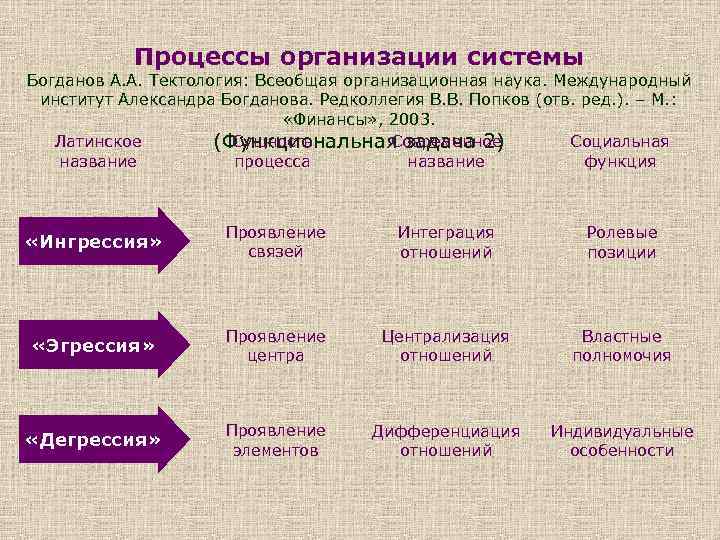 Процессы организации системы Богданов А. А. Тектология: Всеобщая организационная наука. Международный институт Александра Богданова. Редколлегия В. В. Попков (отв. ред. ). – М. : «Финансы» , 2003. Латинское Сущность Современное Социальная (Функциональная задача 2) название процесса название функция «Ингрессия» Проявление связей Интеграция отношений Ролевые позиции «Эгрессия» Проявление центра Централизация отношений Властные полномочия «Дегрессия» Проявление элементов Дифференциация отношений Индивидуальные особенности