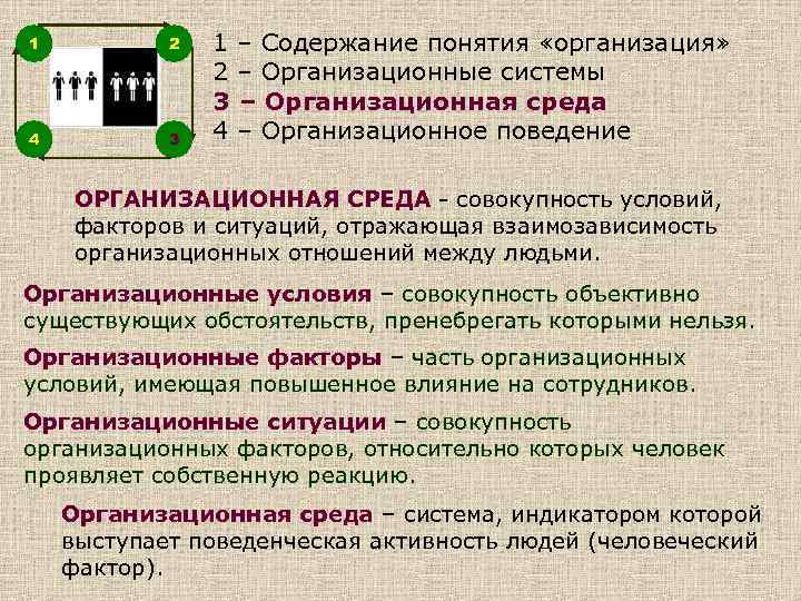 1 2 4 3 1 – Содержание понятия «организация» 2 – Организационные системы 3 – Организационная среда 4 – Организационное поведение ОРГАНИЗАЦИОННАЯ СРЕДА - совокупность условий, факторов и ситуаций, отражающая взаимозависимость организационных отношений между людьми. Организационные условия – совокупность объективно существующих обстоятельств, пренебрегать которыми нельзя. Организационные факторы – часть организационных условий, имеющая повышенное влияние на сотрудников. Организационные ситуации – совокупность организационных факторов, относительно которых человек проявляет собственную реакцию. Организационная среда – система, индикатором которой выступает поведенческая активность людей (человеческий фактор).