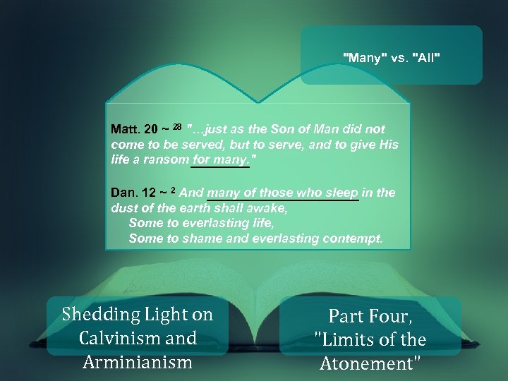 "Many" vs. "All" Matt. 20 ~ 28 "…just as the Son of Man did not come to be served, but to serve, and to give His life a ransom for many. " Dan. 12 ~ 2 And many of those who sleep in the dust of the earth shall awake, Some to everlasting life, Some to shame and everlasting contempt. Shedding Light on Calvinism and Arminianism Part Four, "Limits of the Atonement"
