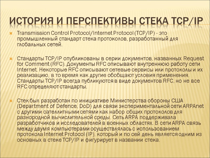 История и перспективы стека TCP/IP Transmission Control Protocol/Internet Protocol (TCP/IP) - это промышленный стандарт стека протоколов, разработанный для глобальных сетей. Стандарты TCP/IP опубликованы в серии документов, названных Request for Comment (RFC). Документы RFC описывают внутреннюю работу сети Internet. Некоторые RFC описывают сетевые сервисы или протоколы и их реализацию, в то время как другие обобщают условия применения. Стандарты TCP/IP всегда публикуются в виде документов RFC, но не все RFC определяют стандарты. Стек был разработан по инициативе Министерства обороны США (Department of Defence, DoD) для связи экспериментальной сети ARPAnet с другими сателлитными сетями как набор общих протоколов для разнородной вычислительной среды. Сеть ARPA поддерживала разработчиков и исследователей в военных областях. В сети ARPA связь между двумя компьютерами осуществлялась с использованием протокола Internet Protocol (IP), который и по сей день является одним из основных в стеке TCP/IP и фигурирует в названии стека.