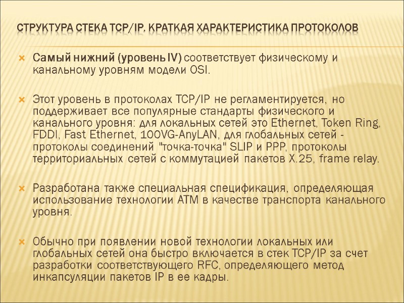 Структура стека TCP/IP. Краткая характеристика протоколов Самый нижний (уровень IV) соответствует физическому и канальному уровням модели OSI. Этот уровень в протоколах TCP/IP не регламентируется, но поддерживает все популярные стандарты физического и канального уровня: для локальных сетей это Ethernet, Token Ring, FDDI, Fast Ethernet, 100VG-AnyLAN, для глобальных сетей - протоколы соединений "точка-точка" SLIP и PPP, протоколы территориальных сетей с коммутацией пакетов X.25, frame relay. Разработана также специальная спецификация, определяющая использование технологии ATM в качестве транспорта канального уровня. Обычно при появлении новой технологии локальных или глобальных сетей она быстро включается в стек TCP/IP за счет разработки соответствующего RFC, определяющего метод инкапсуляции пакетов IP в ее кадры.