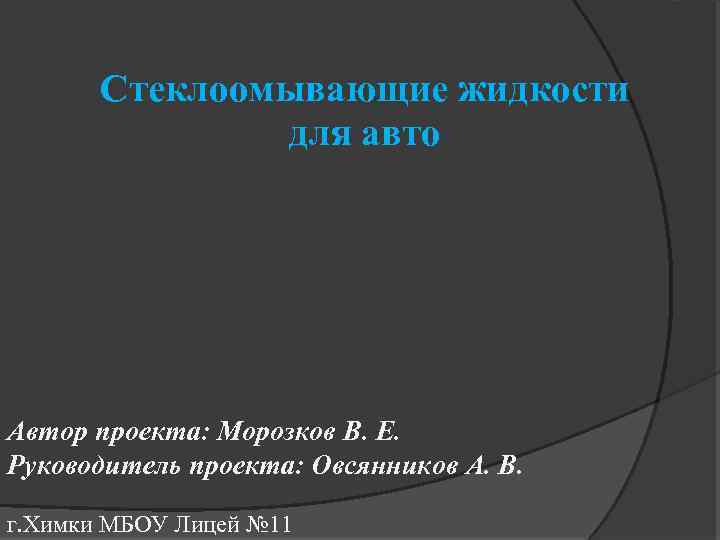 Стеклоомывающие жидкости для авто Автор проекта: Морозков В. Е. Руководитель проекта: Овсянников А. В. г. Химки МБОУ Лицей № 11