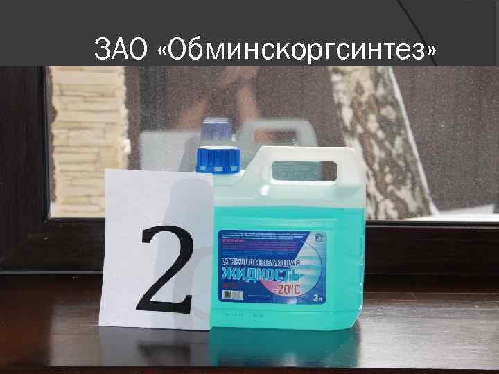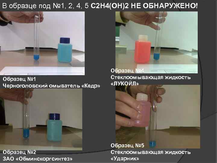 В образце под № 1, 2, 4, 5 C 2 H 4(OH)2 НЕ ОБНАРУЖЕНО! Образец № 1 Черноголовский омыватель «Кедр» Образец № 4 Стеклоомывающая жидкость «ЛУКОЙЛ» Образец № 2 ЗАО «Обминскоргсинтез» Образец № 5 Стеклоомывающая жидкость «Ударник»