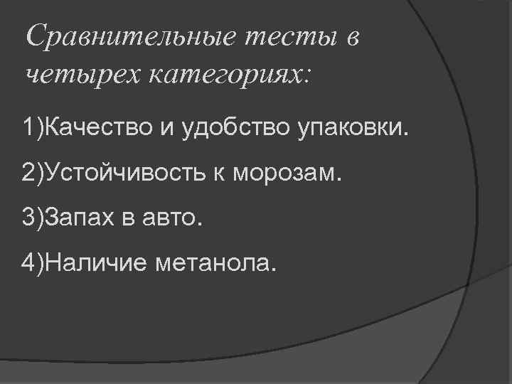 Сравнительные тесты в четырех категориях: 1)Качество и удобство упаковки. 2)Устойчивость к морозам. 3)Запах в авто. 4)Наличие метанола.