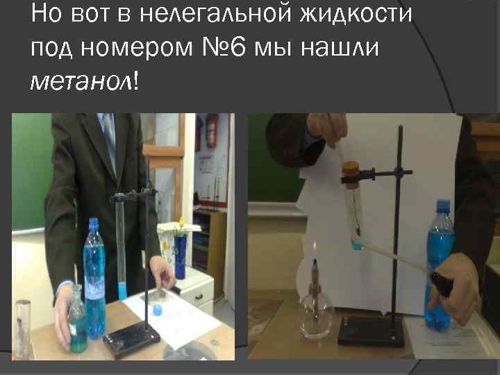 Но вот в нелегальной жидкости под номером № 6 мы нашли метанол!
