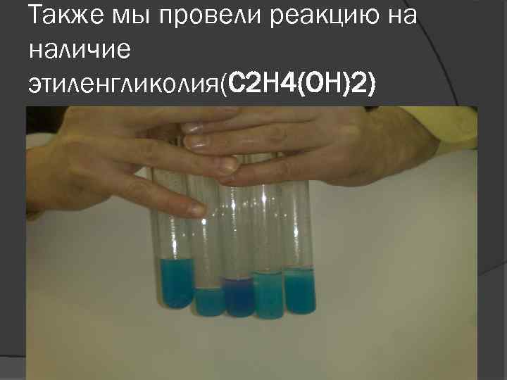 Также мы провели реакцию на наличие этиленгликолия(C 2 H 4(OH)2)