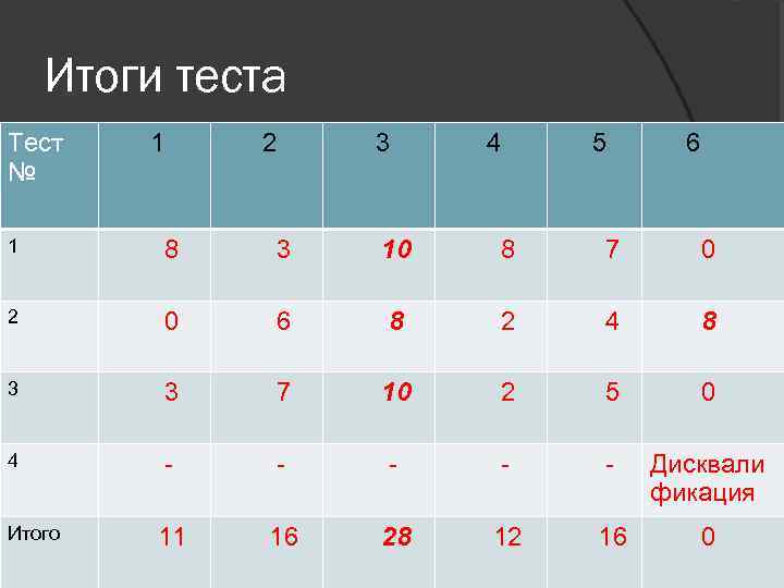 Итоги теста Тест № 1 2 3 4 5 6 1 8 3 10 8 7 0 2 0 6 8 2 4 8 3 3 7 10 2 5 0 4 - - - Дисквали фикация 11 16 28 12 16 0 Итого