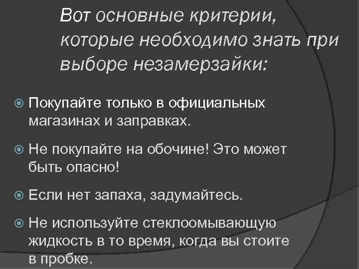 Вот основные критерии, которые необходимо знать при выборе незамерзайки: Покупайте только в официальных магазинах и заправках. Не покупайте на обочине! Это может быть опасно! Если нет запаха, задумайтесь. Не используйте стеклоомывающую жидкость в то время, когда вы стоите в пробке.