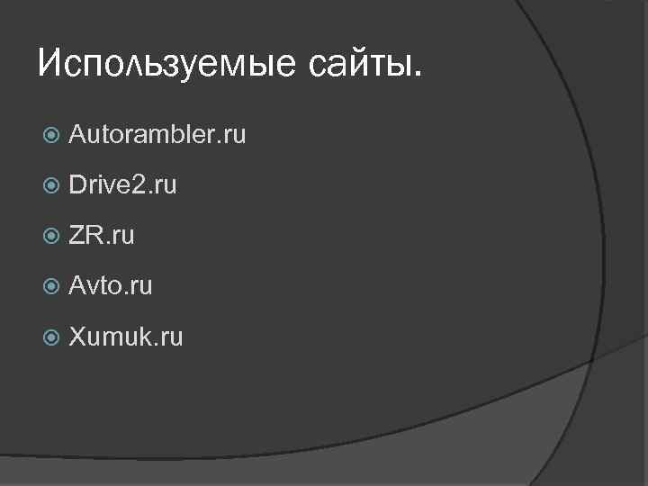 Используемые сайты. Autorambler. ru Drive 2. ru ZR. ru Avto. ru Xumuk. ru