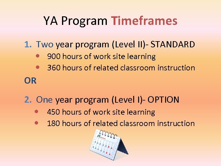 YA Program Timeframes 1. Two year program (Level II)- STANDARD 900 hours of work site learning 360 hours of related classroom instruction OR 2. One year program (Level I)- OPTION 450 hours of work site learning 180 hours of related classroom instruction