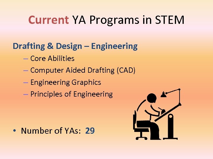 Current YA Programs in STEM Drafting & Design – Engineering – Core Abilities – Computer Aided Drafting (CAD) – Engineering Graphics – Principles of Engineering • Number of YAs: 29