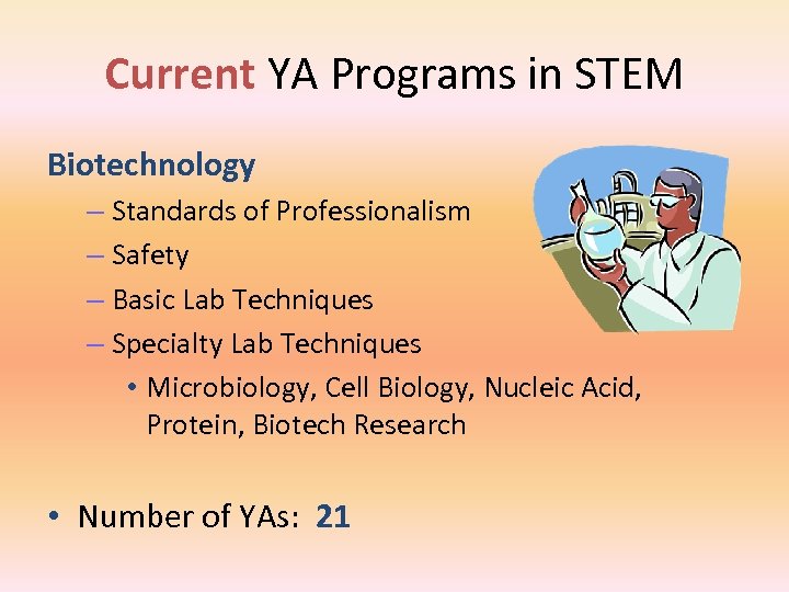 Current YA Programs in STEM Biotechnology – Standards of Professionalism – Safety – Basic Lab Techniques – Specialty Lab Techniques • Microbiology, Cell Biology, Nucleic Acid, Protein, Biotech Research • Number of YAs: 21