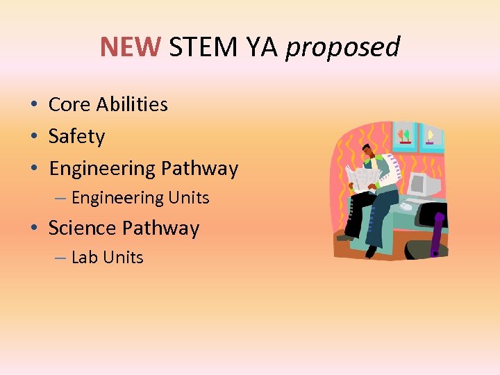 NEW STEM YA proposed • Core Abilities • Safety • Engineering Pathway – Engineering Units • Science Pathway – Lab Units