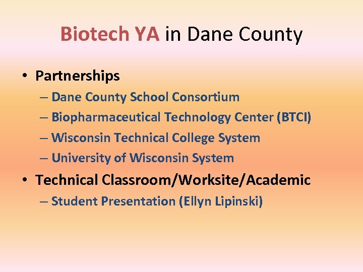 Biotech YA in Dane County • Partnerships – Dane County School Consortium – Biopharmaceutical Technology Center (BTCI) – Wisconsin Technical College System – University of Wisconsin System • Technical Classroom/Worksite/Academic – Student Presentation (Ellyn Lipinski)