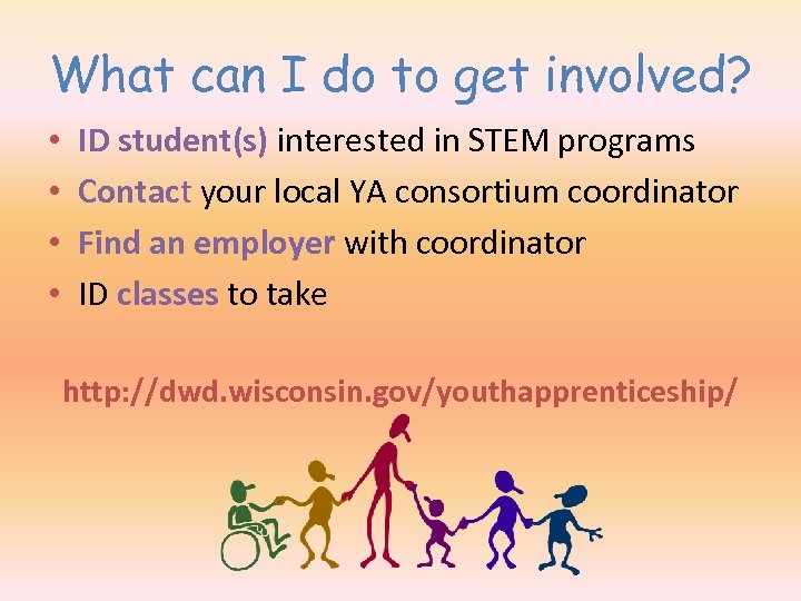 What can I do to get involved? • • ID student(s) interested in STEM programs Contact your local YA consortium coordinator Find an employer with coordinator ID classes to take http: //dwd. wisconsin. gov/youthapprenticeship/