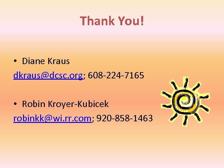 Thank You! • Diane Kraus dkraus@dcsc. org; 608 -224 -7165 • Robin Kroyer-Kubicek robinkk@wi. rr. com; 920 -858 -1463