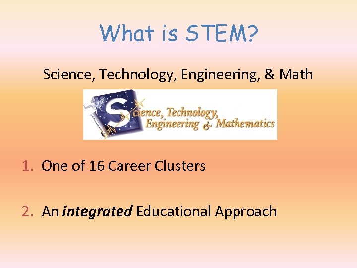 What is STEM? Science, Technology, Engineering, & Math 1. One of 16 Career Clusters 2. An integrated Educational Approach