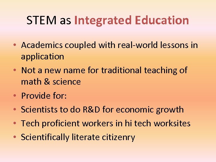STEM as Integrated Education • Academics coupled with real-world lessons in application • Not a new name for traditional teaching of math & science • Provide for: • Scientists to do R&D for economic growth • Tech proficient workers in hi tech worksites • Scientifically literate citizenry