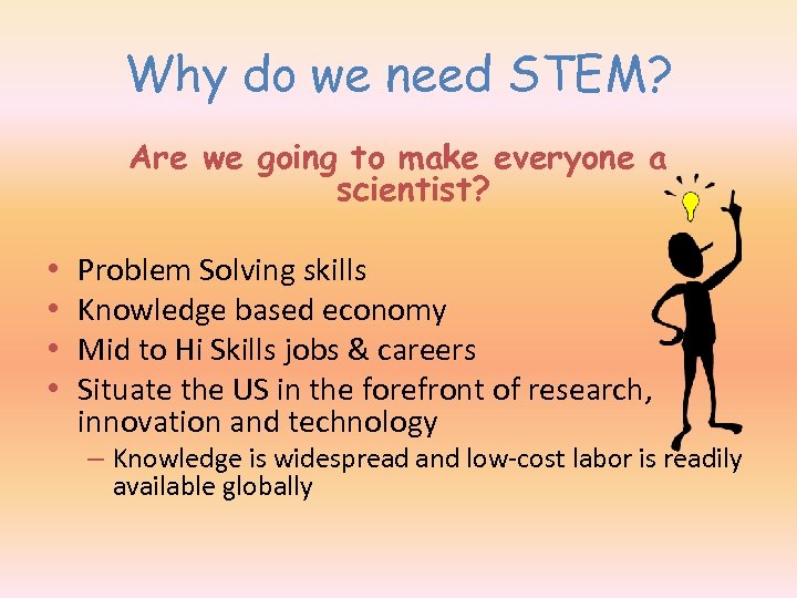Why do we need STEM? Are we going to make everyone a scientist? • • Problem Solving skills Knowledge based economy Mid to Hi Skills jobs & careers Situate the US in the forefront of research, innovation and technology – Knowledge is widespread and low-cost labor is readily available globally