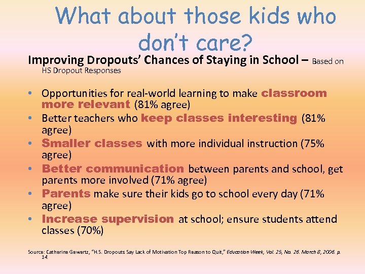 What about those kids who don’t care? Improving Dropouts’ Chances of Staying in School – Based on HS Dropout Responses • Opportunities for real-world learning to make classroom more relevant (81% agree) • Better teachers who keep classes interesting (81% agree) • Smaller classes with more individual instruction (75% agree) • Better communication between parents and school, get parents more involved (71% agree) • Parents make sure their kids go to school every day (71% agree) • Increase supervision at school; ensure students attend classes (70%) Source: Catherine Gewertz, “H. S. Dropouts Say Lack of Motivation Top Reason to Quit, ” Education Week, Vol. 25, No. 26. March 8, 2006. p. 14.