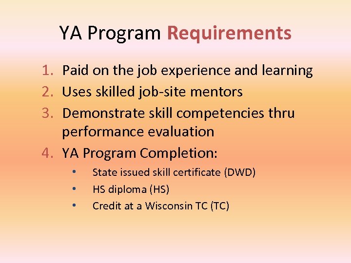 YA Program Requirements 1. Paid on the job experience and learning 2. Uses skilled job-site mentors 3. Demonstrate skill competencies thru performance evaluation 4. YA Program Completion: • • • State issued skill certificate (DWD) HS diploma (HS) Credit at a Wisconsin TC (TC)