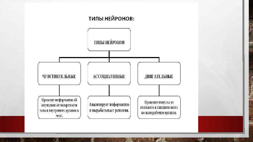 ТИПЫ НЕЙРОНОВ: • По структуре и функции различают три типа нейронов: • Рецепторные, или чувствительные; • Вставочные, замыкательные (кондукторные они же ассоциативные); • Эффекторные, двигательные нейроны, от которых импульс направляется к рабочим органам (мышцам, железам).