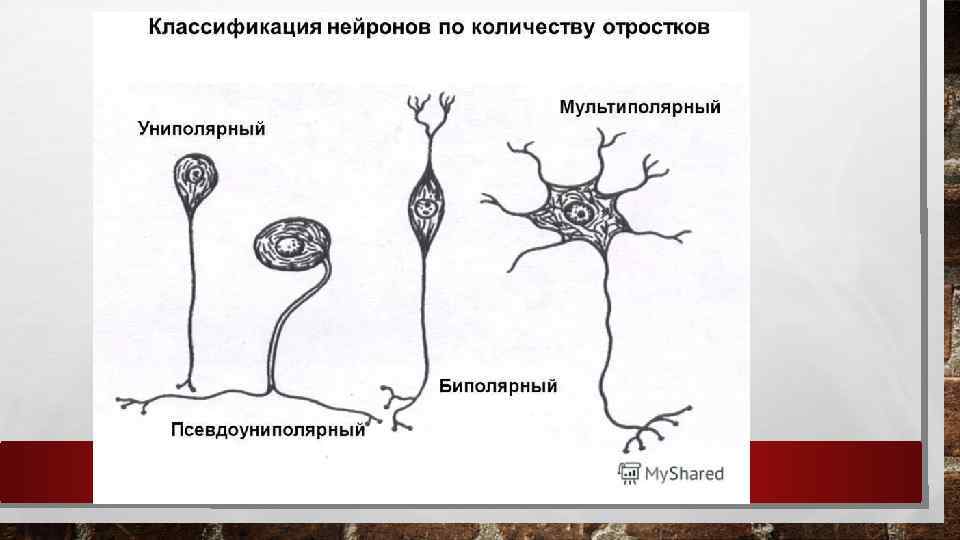 ТИПЫ НЕЙРОНОВ: • По количеству отростков нейроны делятся на • биполярные(двухполюсные) с двумя отростками, • мультиполярные (многополюсные) с несколькими отростками, • псевдоуниполярные(ложноднополюсные) это нейроны, аксон и дендрит которых начинаются от общего выроста тела клетки с последующим Т образным делением. Такая форма клеток характерна для чувствительных нейронов.