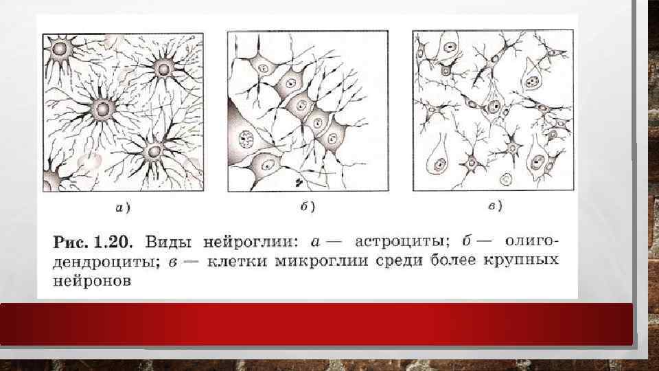 КЛАССИФИКАЦИЯ ГЛИИ. • Микроглиальные клетки, хоть и входят в понятие «глия» , не являются собственно нервной тканью, так как имеют мезодермальное происхождение. Они представляют собой мелкие отростчатые клетки, разбросанные по белому и серому веществу мозга и способные к фагоцитозу. • Макроглия — производная глиобластов, выполняет опорную, разграничительную, трофическую и секреторную функции.