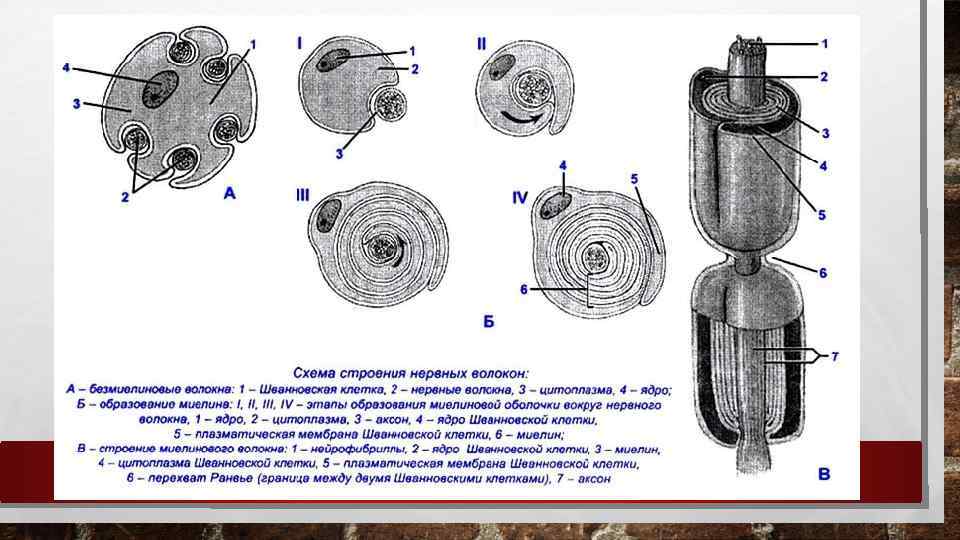 СТРОЕНИЕ НЕРВНОГО ВОЛОКНА. • Нервные волокна образованы отростками нейронов. В зависимости от того, имеют ли они слой миелина, они делятся на безмиелиновые (безмякотные) и миелиновые (мякотные). Первые преобладают в вегетативной, а вторые — в соматической части нервной системы.