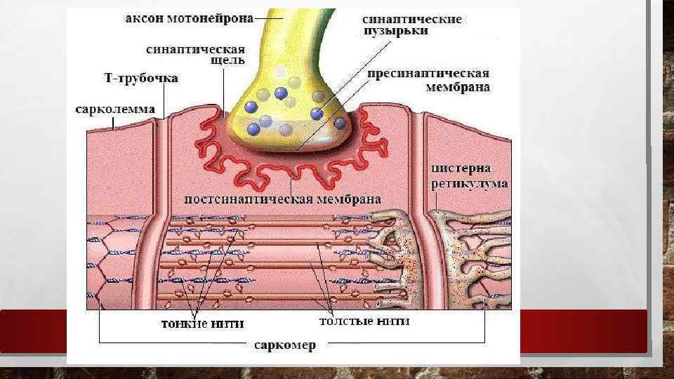 СТРОЕНИЕ СИНАПСА. • Синапс имеет слудующие структурные элементы: пресинаптическое окончание, постсинаптическую мембрану и связываю щую их синаптическую щель. Однако структура нервно мышечного синап са имеет отличия от других синапсов, свя занные с иннервацией длинных клеток (миоцитов) и необходимостью из одного синапса при передаче одного импульса практически одновременно активировать все сократитель ные единицы (саркомеры) миоцита.