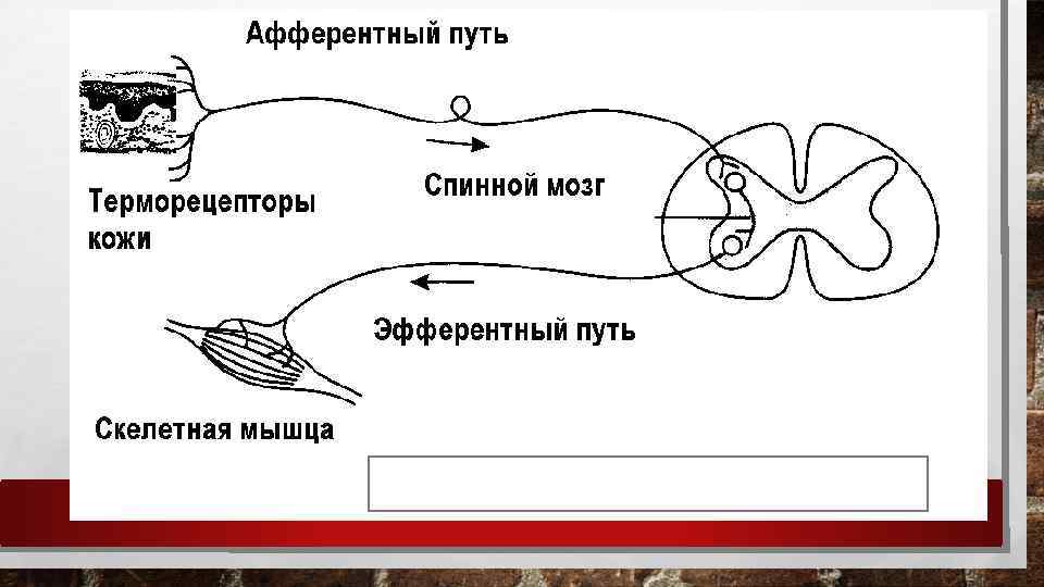 СТРОЕНИЕ РЕФЛЕКТОРНОЙ ДУГИ. • Рефлекторная дуга (нервная дуга) — путь, проходимый нервными импульсами при осуществлении рефлекса. • Рефлекторная дуга состоит из: • Рецептора — нервное звено, воспринимающее раздражение; • Афферентного звена — центростремительное нервное волокно — отростки рецепторных нейронов, осуществляющие передачу импульсов от чувствительных нервных окончаний в центральную нервную систему; • Центрального звена — нервный центр (необязательный элемент, например для аксон рефлекса); • Эфферентного звена — осуществляют передачу от нервного центра к эффектору; • Эффектора — исполнительный орган, деятельность которого изменяется в результате рефлекса.