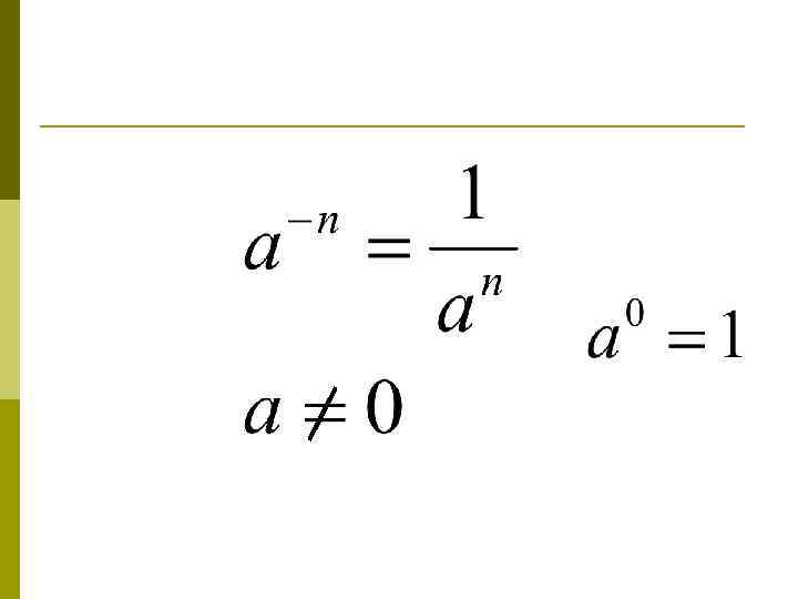 Повторение Степень с целым показателем Степенью числа а с натуральным показателем n, большим 1, называется произведение n множителей, каждый из которых равен а