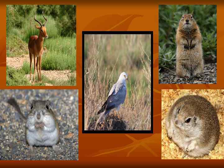 Животный мир степи n n n Имеет много общего с животным миром пустыни; Животным приходится приспосабливаться как к высоким так и к низким температурам; Животные активны летом преимущественно ночью; Из копытных типичны виды, отличающиеся острым зрением и способностями к быстрому и длительному бегу( антилопы); Большая часть птиц на зиму улетает.