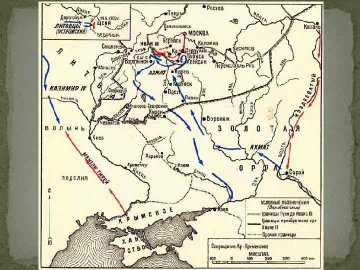 В 1492 году Иван III стал официально величаться «государь всея Руси» . Но еще в 1480 году Иван III стал подготавливать политическую почву для свержения ордынского ига. Как только в Москве получили с Дикиго поля точное известие, что хан Ахмат со всей своей силой к Дону, великий князь выставил полки на Оке. Хан Ахмат, узнав, что на Оке выставлены сильные полки, пошел к Калуге, на соединение с Казимиром. Определив направление похода Орды Иван III перехватил ее на реке Угре.
