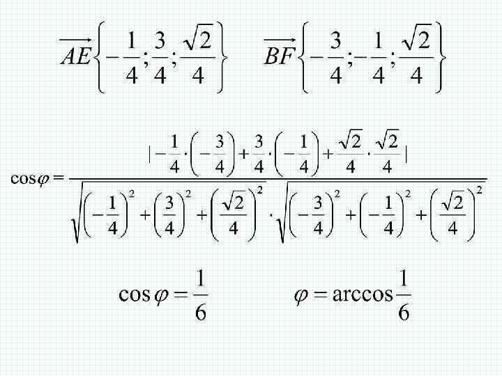 Задача 1 В единичном кубе найдите угол между прямыми AE и BF, где Е – середина ребра , а F – середина ребра Решение (1 способ) К - середина По теореме косинусов для