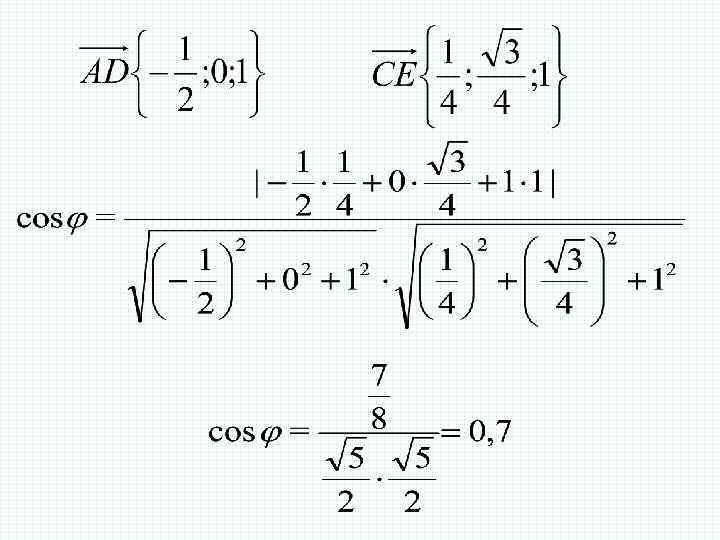 Задача 2 В правильной треугольной призме все ребра которой равны 1, найдите косинус угла между прямыми AD и CE, где D и E - соответственно середины ребер и Решение.