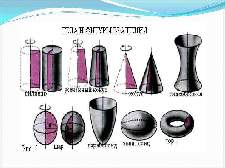 Примеры тел вращения Шар — образован полукругом, вращающимся вокруг диаметра разреза Цилиндр — образован прямоугольником, вращающимся вокруг одной из сторон За площадь боковой поверхности цилиндра принимается площадь его развертки: Sбок = 2πrh. Конус — образован прямоугольным треугольником, вращающимся вокруг одного из катетов За площадь боковой поверхности конуса принимается площадь ее развертки: Sбок = πrl Площадь полной поверхности конуса: Sкон = πr(l+ r) Тор — образован окружностью, вращающейся вокруг прямой, не пересекающей его